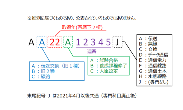公式には一切明らかにされていませんが、資格者証番号によって、取得年、専門科目、おそらくは取得方法についても分かるようになっているようです。現時点では、過去の状況および資格者証申請書の記載内容からは下記のような番号体系だと推測されます。(あくまで推測です。)