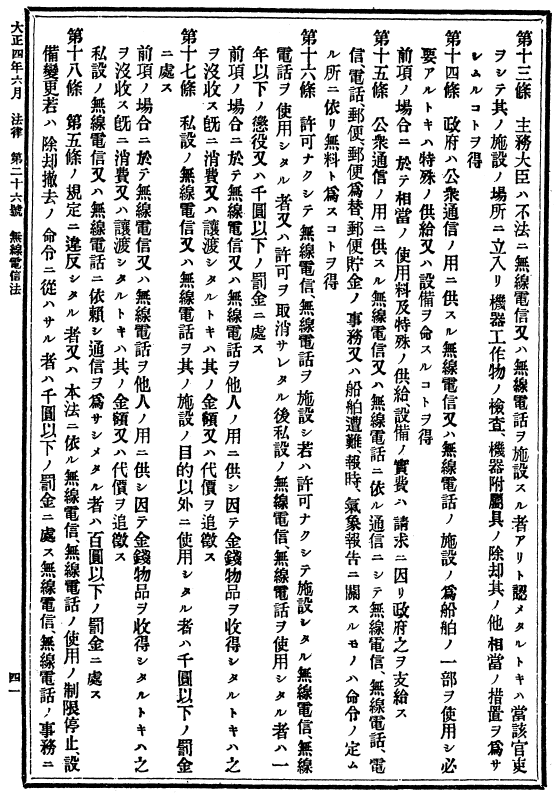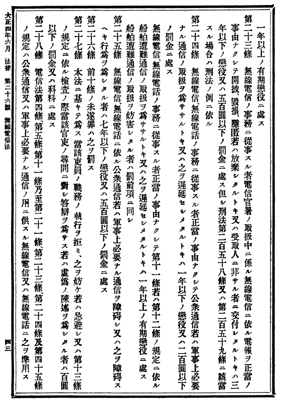 - 無線電信又ハ無線電話ニ依リ公安ヲ妨害シ又ハ風俗ヲ壞亂スル通信ヲ發シタル者ハ二年以下ノ懲役又ハ五百圓以下ノ罰金ニ處ス