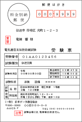 試験日のおよそ2週間程度前に、ハガキで受験票が送られてきます。受験票には受験会場の詳細、受験番号、注意事項などが書いてありますので、よく読んでおきましょう。