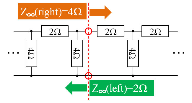この事自体は決して回路的に間違いではありません。ですが、無限に続く回路なので「任意の場所で切断」しても「左右方向の特性が同じ」であった方が、より適切な回路網表現であると言えるでしょう。